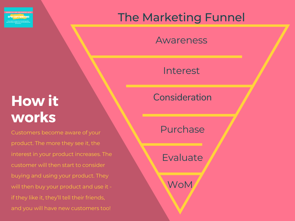 They become aware of your product. The more they see it, the interest in your product increases. The customer will then start to consider buying and using your product. They will then buy your product and use it - if they like it, they’ll tell their friends, and you will have new customers too!